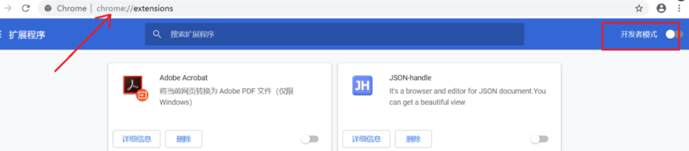 打开Chrome的扩展页面(chrome:// extensions /或按Chrome菜单图标>更多工具>扩展程序),右上角开发者模式,点击开启,蓝色为开启,灰色为关闭;