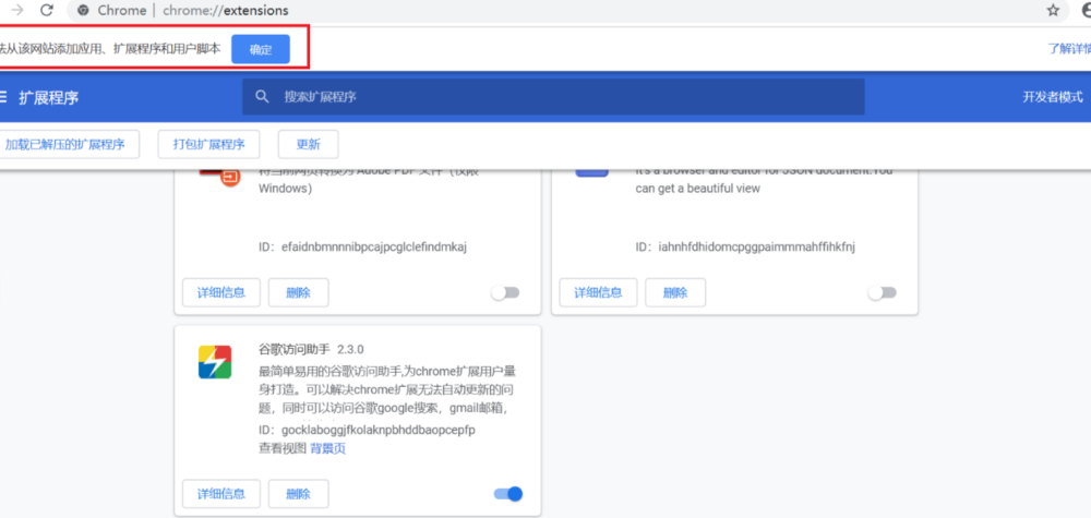 再次将crx文件拖放到扩展程序,页面左下角提示:“扩展功能、应用和主题背景可能会损害您的计算机。您确定要继续吗?”