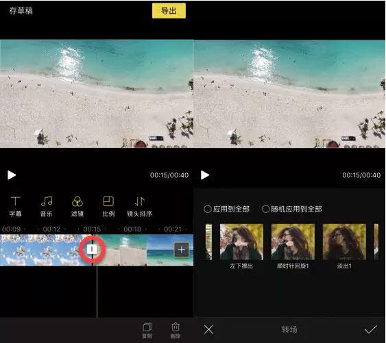 当你的素材有两个以上的时候,素材之间的接驳位置会出现一个按钮,点击后可以添加转场效果。转场提供了50多种样式可供选择,和添加滤镜一样,转场也提供了一键“应用到全部”和“随机应用到全部”的功能。