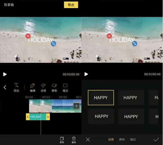 进入视频编辑界面后点击“字幕”即可为视频加字幕,输入文字后可以设定字幕的动效、颜色和描边加粗,在轨道上可以通过拖拽来调整字幕出现的时间。