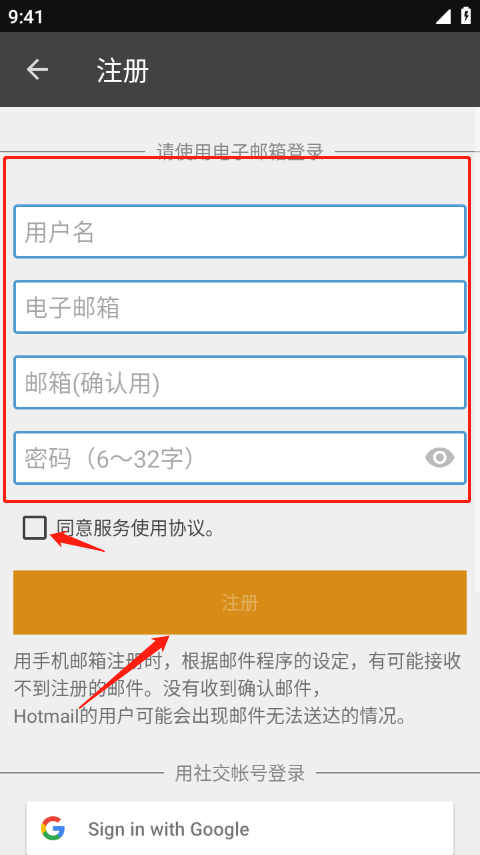 4、随后填写完注册信息用户名,电子邮箱以及密码之后,勾选同意服务使用协议,点击注册。