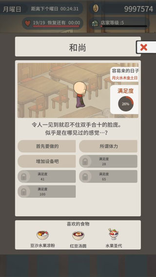 顾客吃了料理,他们的满意度会相应上升,满意度上升后还会引发对话。游戏中的金币主要用来购买店内设备,例如能够增加制作料理总上限的料理放置台,餐桌用来增加在店内吃饭顾客的人数上限,以及冷藏库、收银机等等提高各项属性的道具。在进入店内的每位食客都有着独特喜欢的料理,不断地吸引食客来吃饭从而增加每个食客的满足度。随着满足度的增加会触发不同食客的特殊对话剧情。