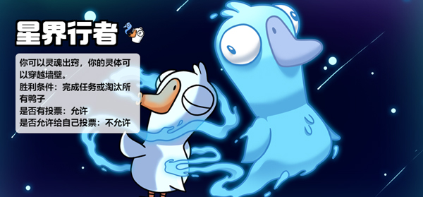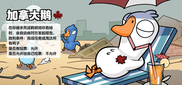 6、除了鹅和鸭之外还可以有一些中立角色来平衡双方势力,中立角色的获胜方式具体由所选择角色来决定。(如呆呆鸟需要被公投出局来取胜)