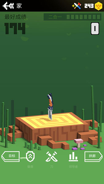 在“二合一”这个模式中 自我感觉是最简单的 技巧也是最容易掌握的 只要拉住刀 让那个白色的圆圈刚好碰到屏幕上方那个黑边的下方 刀基本就可以在空中转两圈 然后正好立在木桩上(只试过重量1的开局给你的那把蓝柄小刀 类似的也差不多吧……) 此方法容易刷分 也容易刷钱 脸白的话上100是没问题的。
