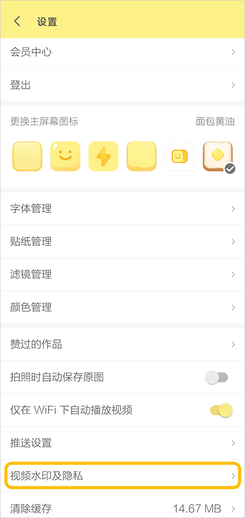1、在app设置界面选择下方的“视频水印及隐私”