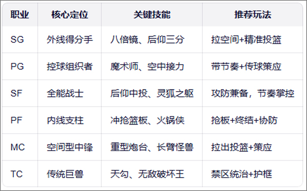 《全民大灌篮》中各个职业百花齐放,有手握球权掌控全场的组织后卫,也有3D射手得分后卫,还有得分旗手小前锋,攻防全面的暴力大前锋,镇守篮下的传统中锋。