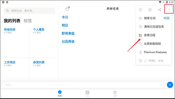 4、还可点击右上角的按钮选择安排日程或清除已完成任务;