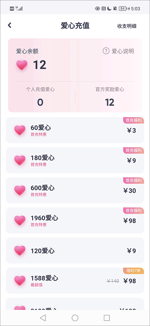 1、首先打开对对APP,通过底部菜单栏进入个人中心,点击爱心充值;