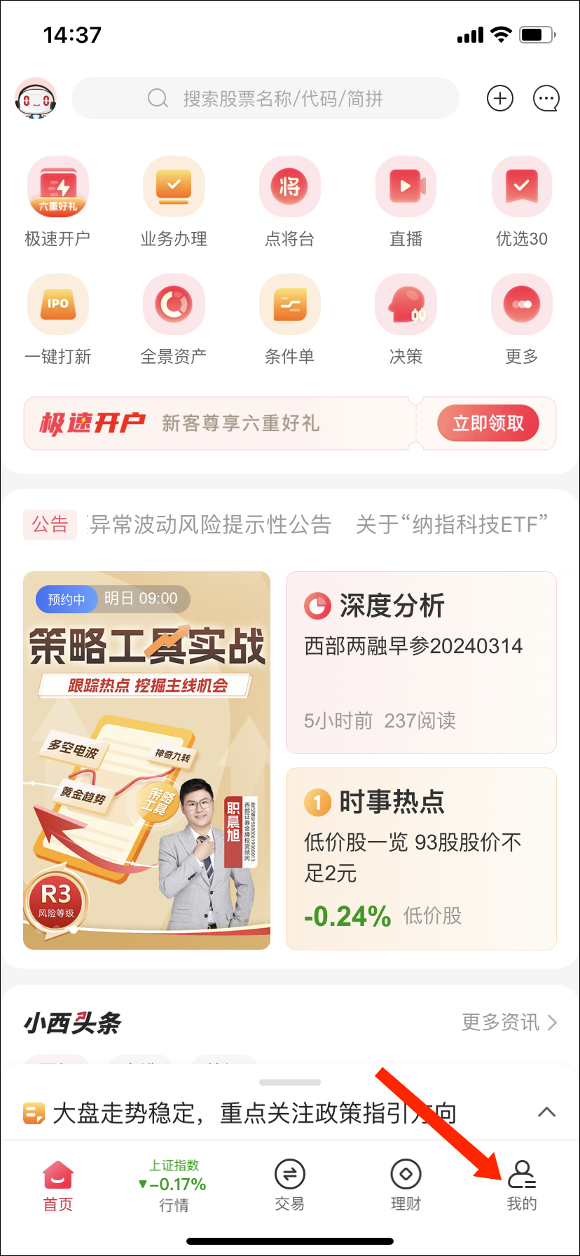 1、首先打开“西部证券”,在下面服务模块找到“我的”并点击,