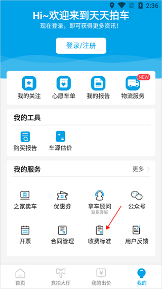 1、经销商用户们可以前往应用【我的】页面中点击【收费标准】