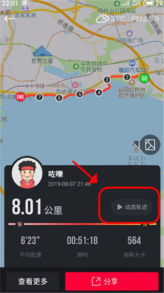 3、也可以是刚刚跑步完成,如图箭头位置。点击“动态运动轨迹”。