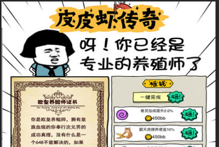 1、前期通过点击升级皮皮虾让它所带来的回报不断升级,获得资金解锁高品质的灵兽;
