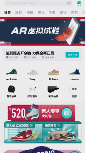 采集球鞋的3D影像展示。用户浏览实现可操控式自转,720度无死角查看单品的材质、图案、纹理、设计细节,为用户打造不一样的沉浸式购物体验。