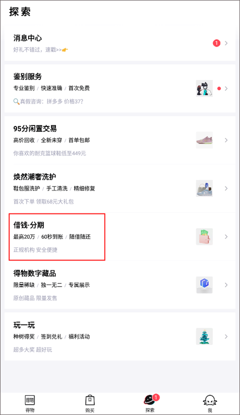 1、选择切换到【探索】界面,这里有很多的功能选项,如得物数字藏品、玩一玩、借钱。分期等,如果你像分期购买商品,可以点击这个“借钱。分期”按钮。