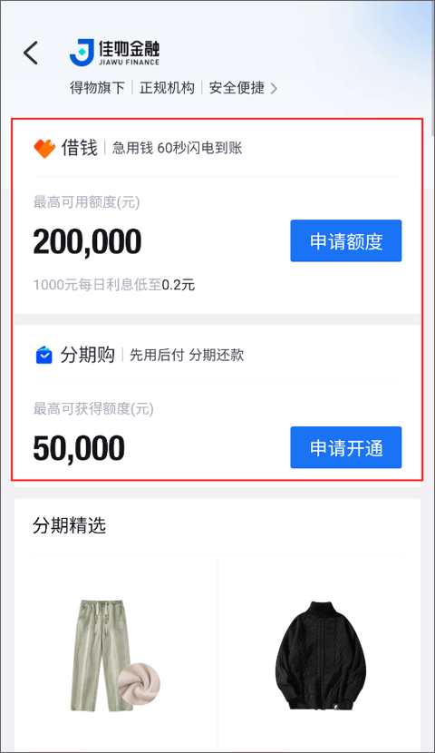 2、这里有20万和5万的分期购买额度,根据你自身的实际情况来进行开通。