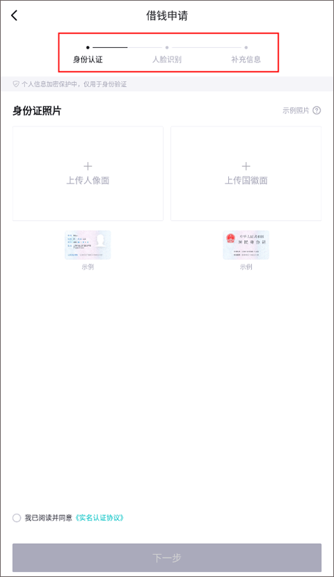 5、跟着这个操作步骤来提供借钱申请:身份认证-人脸识别-补充信息,最后点击提交即可。