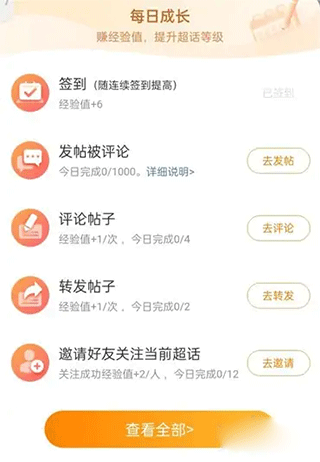 5、找到过已签到之后就可以看到提升超话等级的方法了;