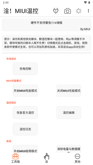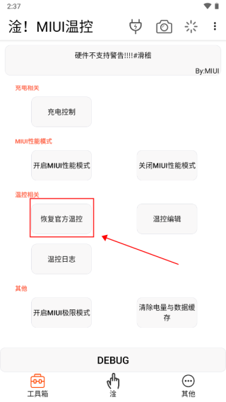 3、点击工具箱可查看其他机型的“淦温控”、充电控制、开启或关闭MIUI性能模式,以及恢复官方温控;