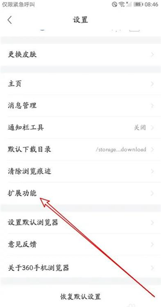 3、这时就会打开360浏览器的设置界面,点击界面中的扩展功能菜单项