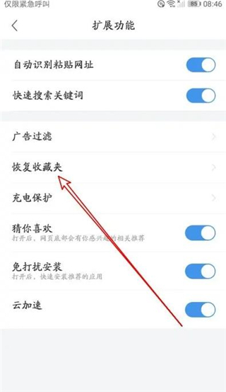 4、然后在打开的扩展功能页面中点击恢复收藏夹的设置菜单