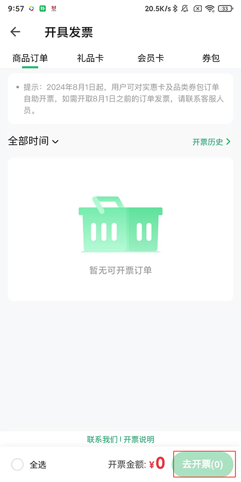 2、在开具发票页面上,选中要开发票的订单后,选择【去开票】选项。