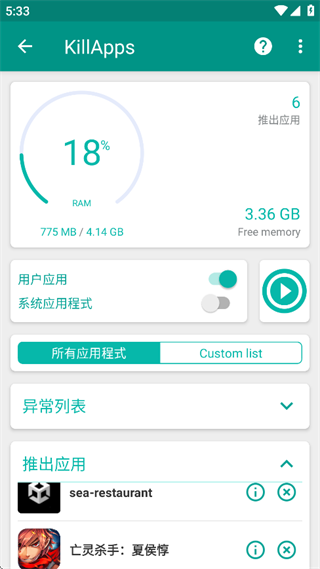 killapps是一款非常专业的优化手机运行内存工具。用户可以使用这款工具快速关闭所有正在运行的应用,有助于加速手机的运行速度并提高手机性能。app原理是通过杀死手机不必要的后台运行软件和进程,提高电池寿命,延长手机使用时间,比国内绝大多数清理软件都要好用,有助于加速游戏并提高游戏性能,彻底改变手机卡顿慢的问题,受到广大用户的一致喜爱。喜欢这款软件的用户快来本站下载吧!