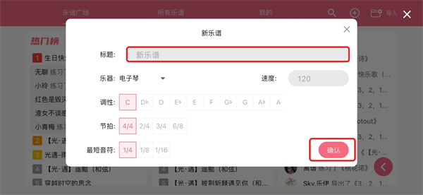 在弹出框,输入和选择合适的乐谱设置,点击确定,即可进入编曲界面。