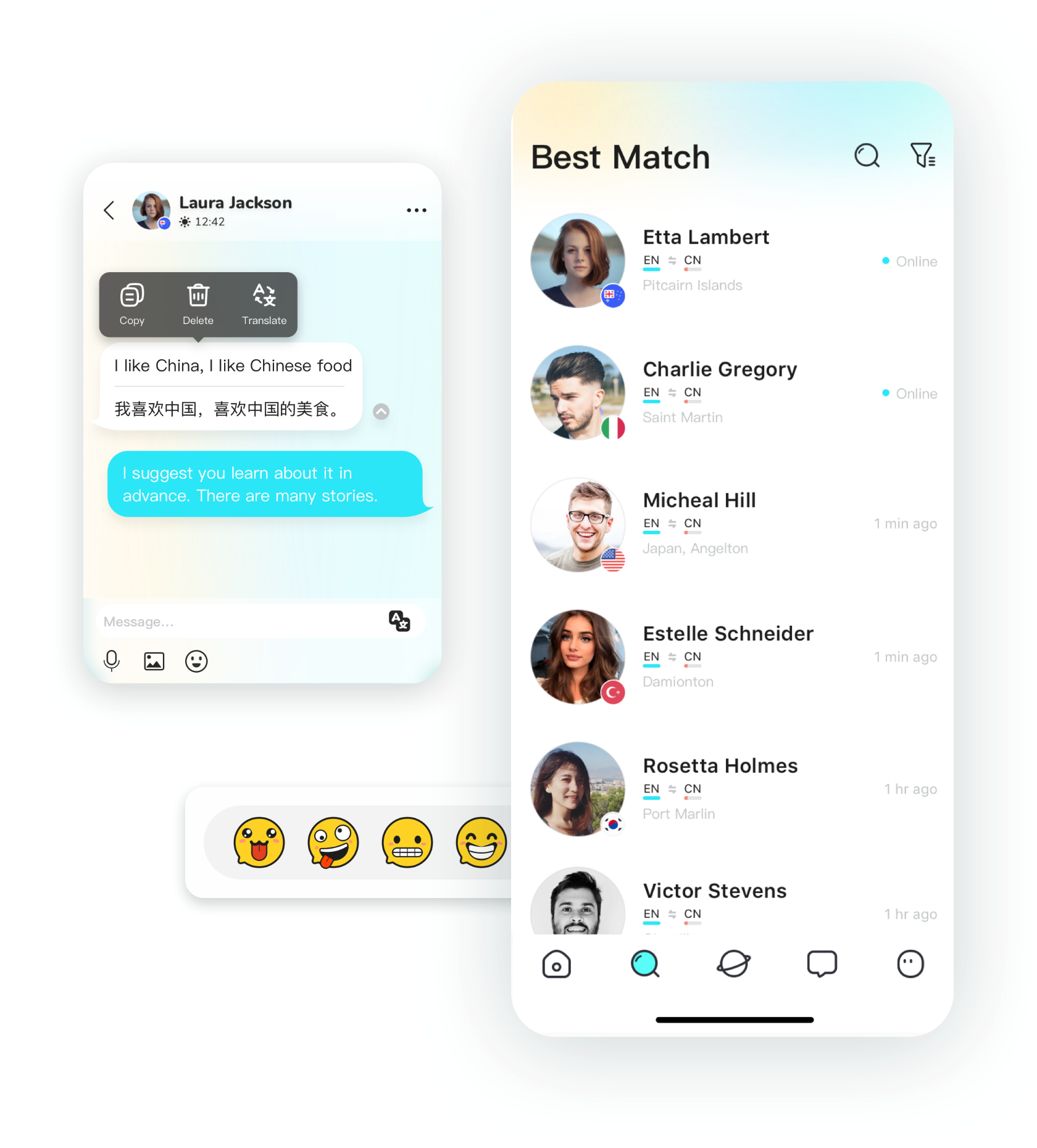 根据您的母语和兴趣语言筛选出适合您的语伴,为你的语言学习、文化交流提供了丰富的对话机会
