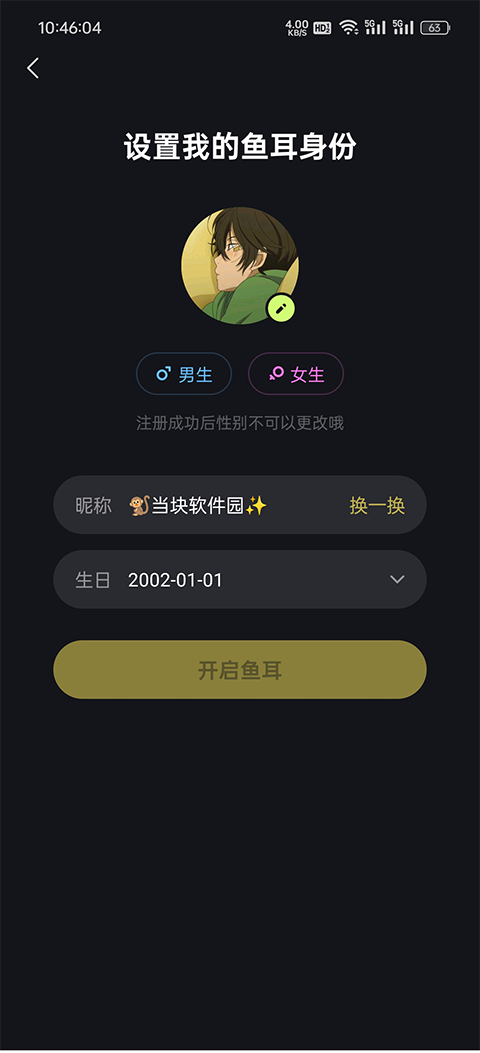 2、接下来用户可以设置自己的身份,包括性别、昵称、生日等基本信息。