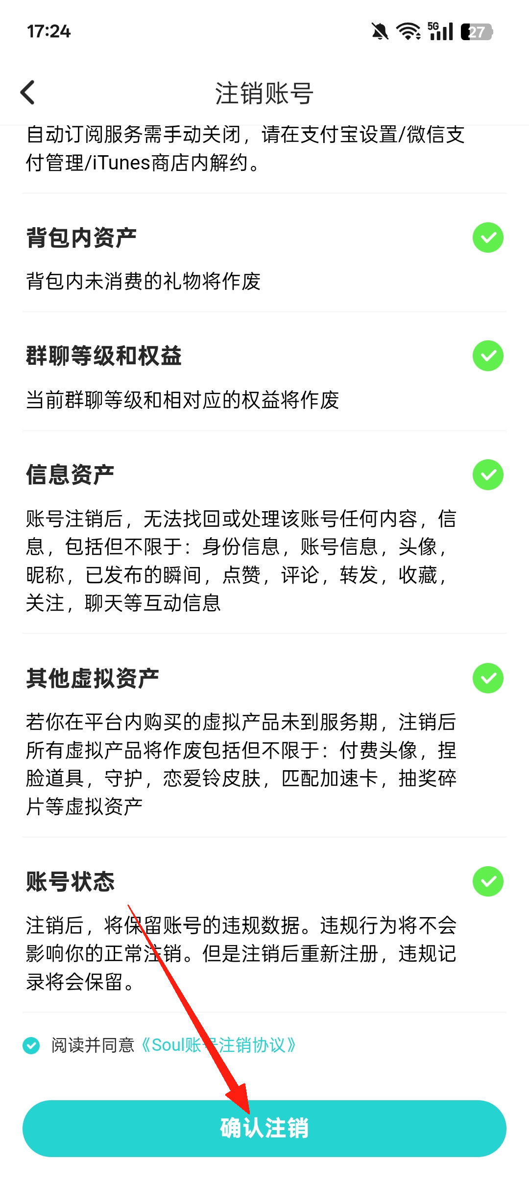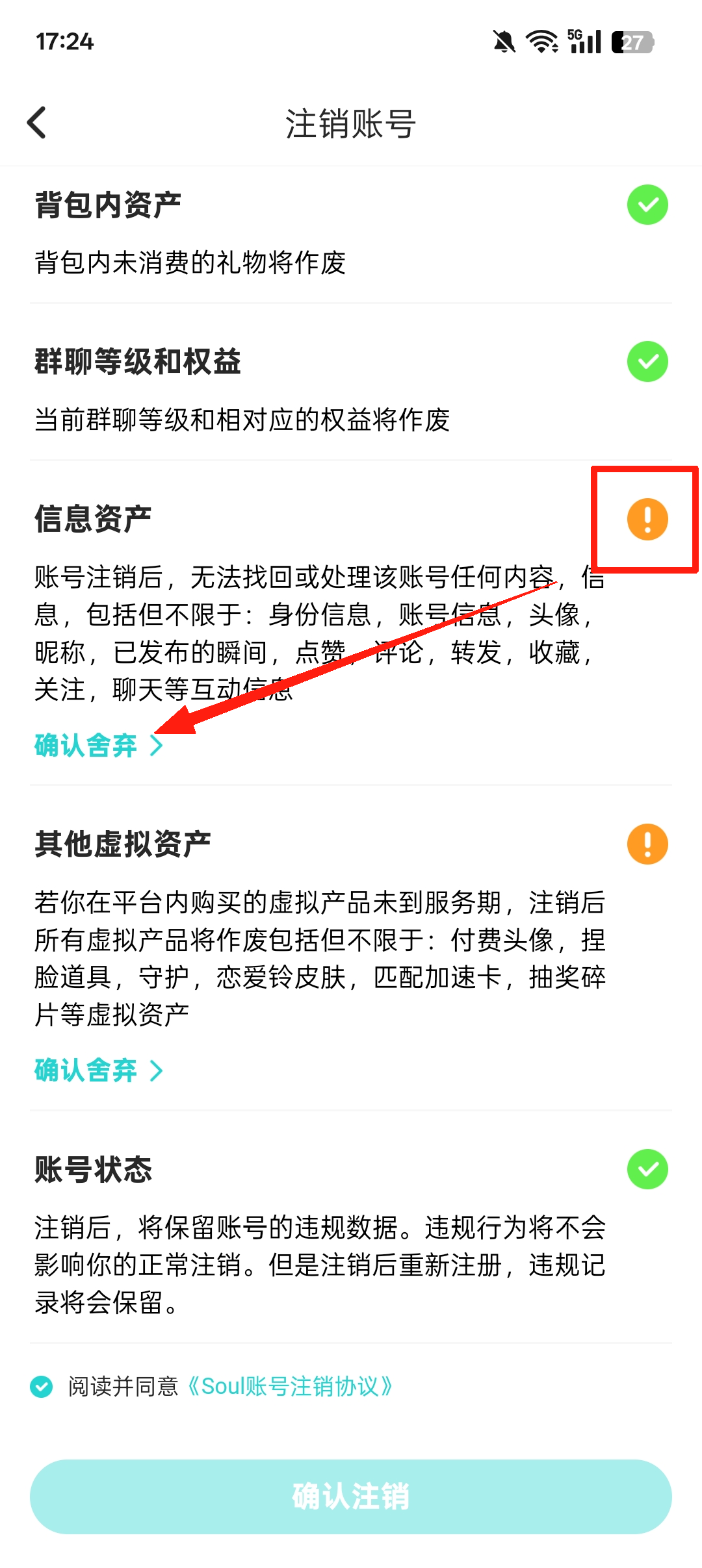 7、全部舍弃之后,点击【确认注销】,之后输入手机验证码即可成功注销