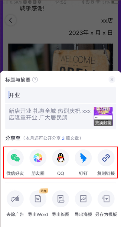 6、制作好的促销宣传海报。你可以将其分享到微信,QQ,钉钉等社交平台。