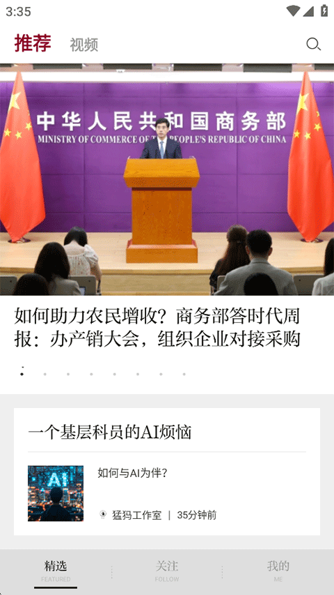 1、打开时代周报APP,在首页浏览系统推荐文章资讯和视频内容;