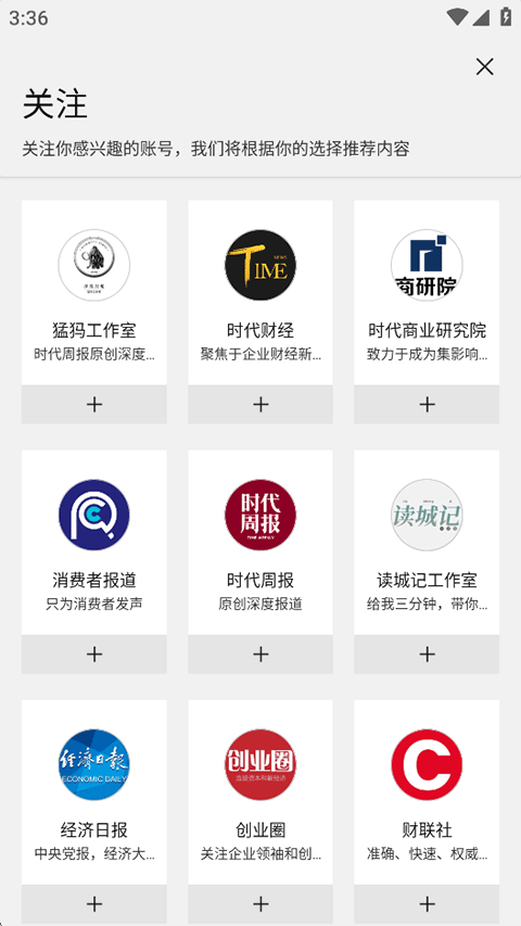 4、点击左上角的添加按钮,选择关注感兴趣的账号;