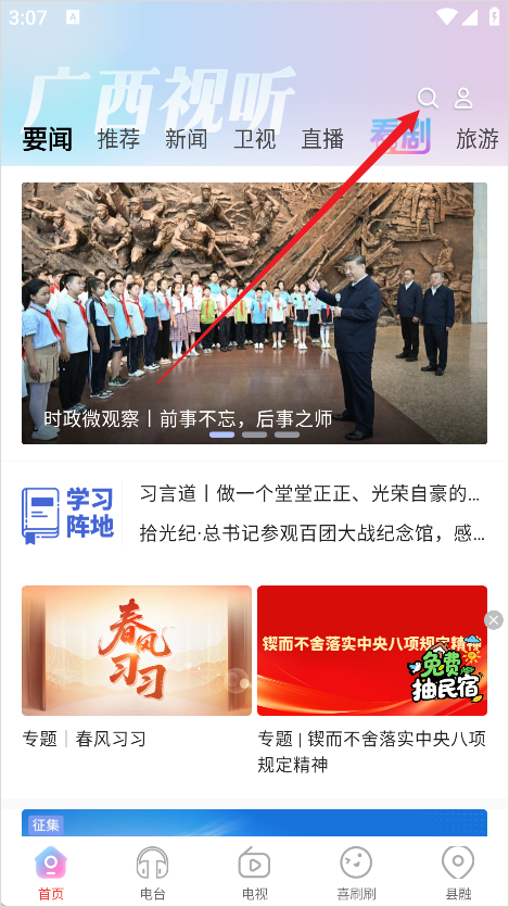 1、首选我们进入广西视听App当中,在首页点击搜索图标;