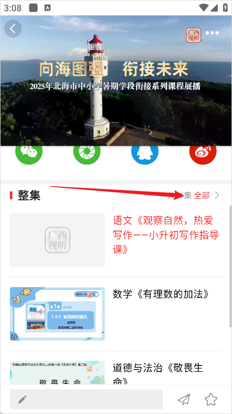 4、进入空中课堂之后,往下滑动就可以看到整集的回放内容了,点击全部;