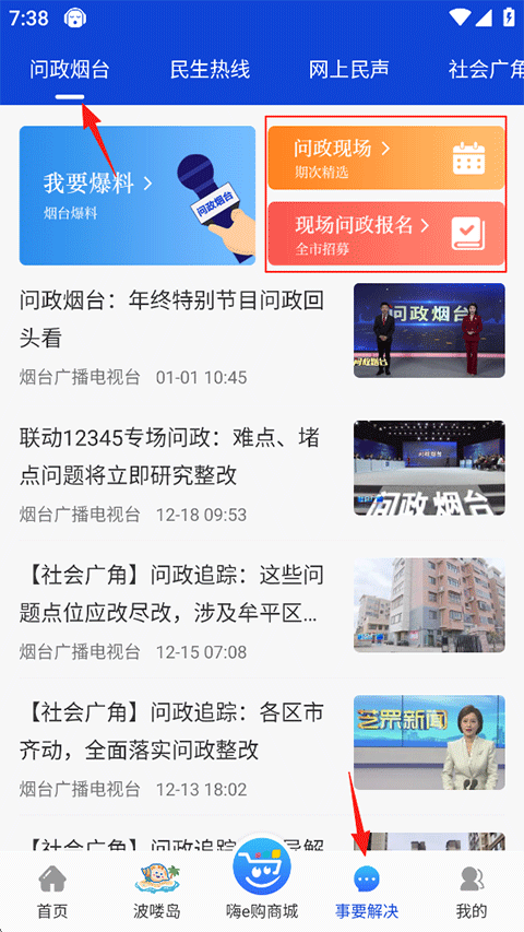 1、打开烟海e家APP,点击事要解决-问政烟台-问政现场/现场问政报名;