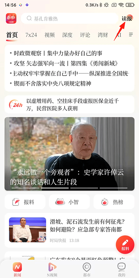 1、打开南方都市报手机客户端,在首页新闻页面可以浏览搜索感兴趣的新闻热点资讯;