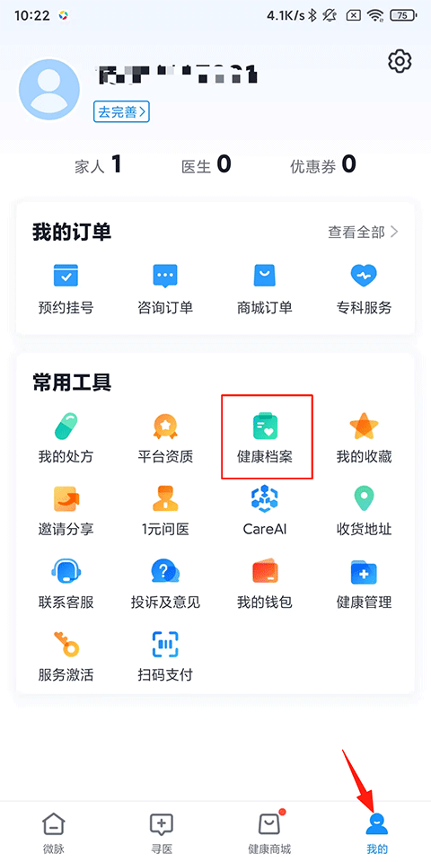 1、打开微脉APP,点击我的-常用工具-健康档案;