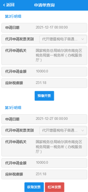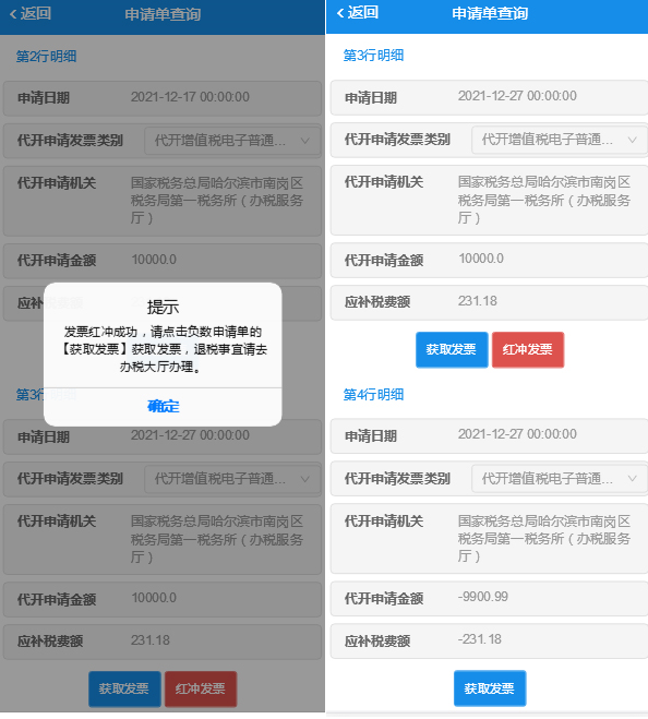 红冲发票审批通过后通过查询功能查询到红字发票并获取发票文件,如下图:
