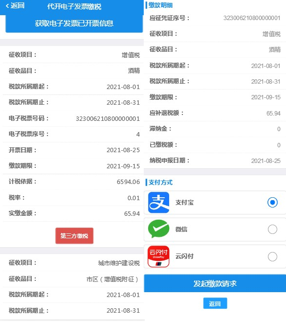 确认信息无误,点击【第三方缴税】,选择支付方式并缴纳税款。