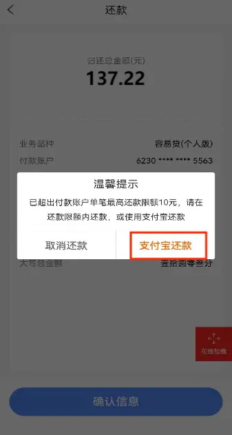 点击确认信息时弹窗提示超限,您可取消还款或直接点击进入我行支付宝还款页