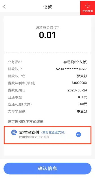 第四步:在您点击还款后,跳转至还款信息确认页,不同银行卡存在不同还款限额。