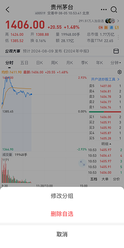4、关注股票后可设置分组:关注状态下显示“设自选”