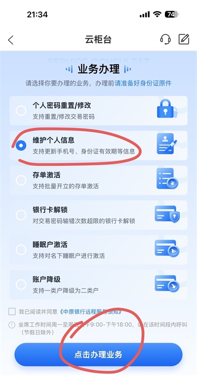 3.勾选“维护个人信息”并同意服务须知,再点击底部的“办理业务”蓝色按钮。