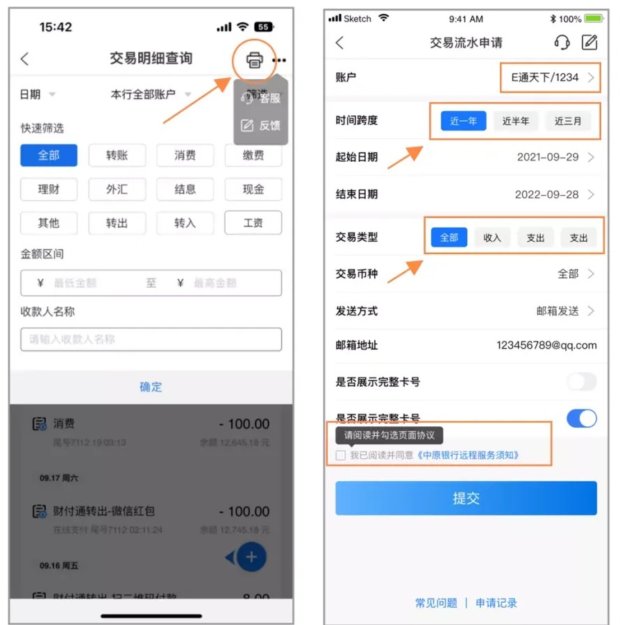 1.功能介绍:用户可在中原银行一点通一键生成电子版交易流水(含电子印章)发送至个人邮箱,解决异地无法前往网点打印问题。