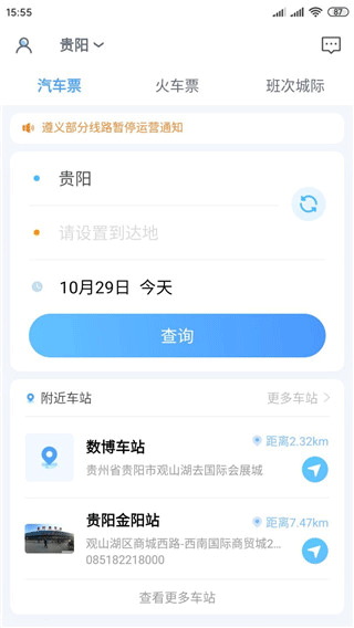 2、贵州好行APP能够为用户查询汽车票、火车票和动车票的票务中心信息;