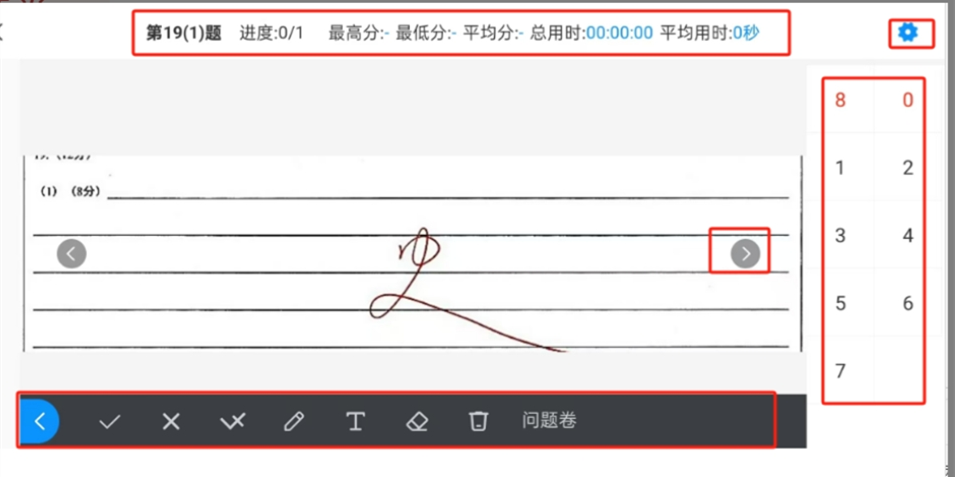 “批阅页面”:上方显示批阅进度,最高分、最低分等信息;右侧显示打分板,点击分值可直接打分;