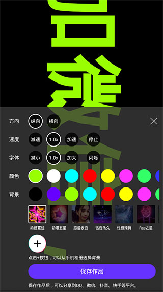 手持弹幕神器是一款有趣的手机投屏弹幕软件,这款软件非常的好玩,并且软件内没有广告推广,使用也非常的简单,只要是能够打字的朋友就能够强轻松的驾驭这款软件,它能够帮助用户将不能说出话或者是间隔太远传不出去的话都在手机上放大说出来,这也是勾搭小姐姐小哥哥的方式之一,无论是地铁上、夜店中还是机场等等都可以使用这款软件,不仅方便还非常的便携,即点即用,操作也非常的简单,只需要输入文字就可以了,用户还可以对文字的方向、速度、字体、颜色、背景等进行设置,让文字更加的炫酷引人注目,快来下载手持弹幕神器发送更多好玩的手机弹幕吧~