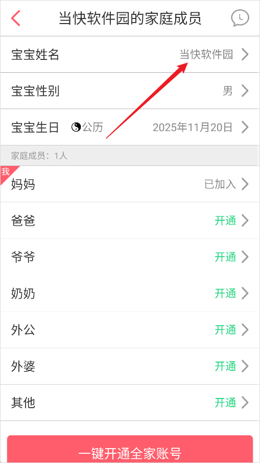 2、在家人列表中找到宝宝的姓名,点击进入编辑界面。