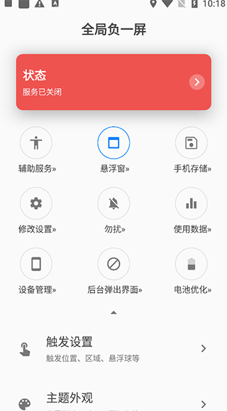 另外,全局负一屏app悬浮窗透明的设计,帮助用户即使是需要看屏幕的情况下,也不会隐藏体验。还有触发设置、主题外观、高级设置、拓展功能等着你来体验,心动的小伙伴赶紧下载试试吧!